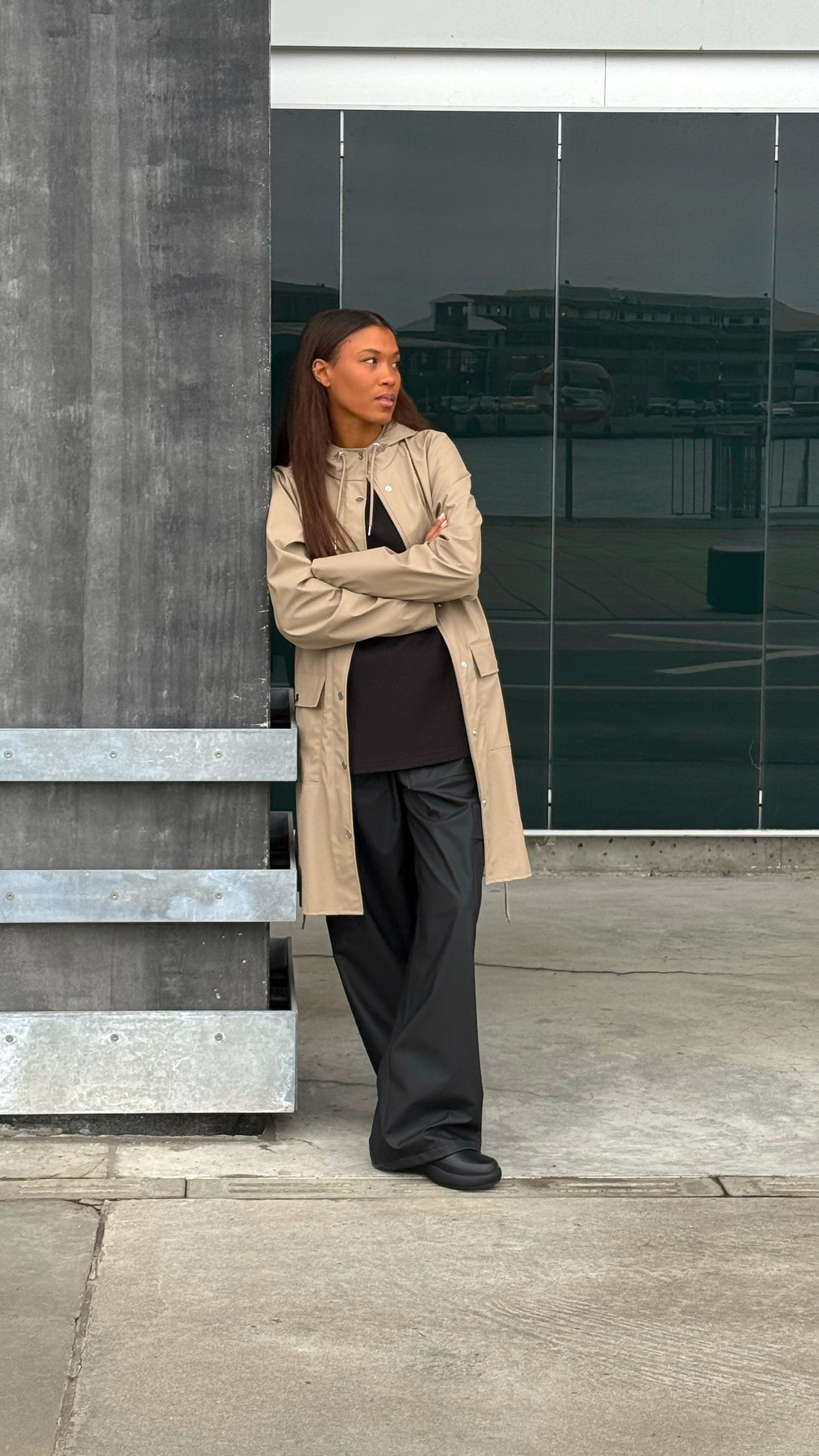Dit ontwerp met een minimaal silhouet is Rains' interpretatie van de dames trenchcoat. Het ontwerp is figuurflatterend met een hoge functionaliteit.