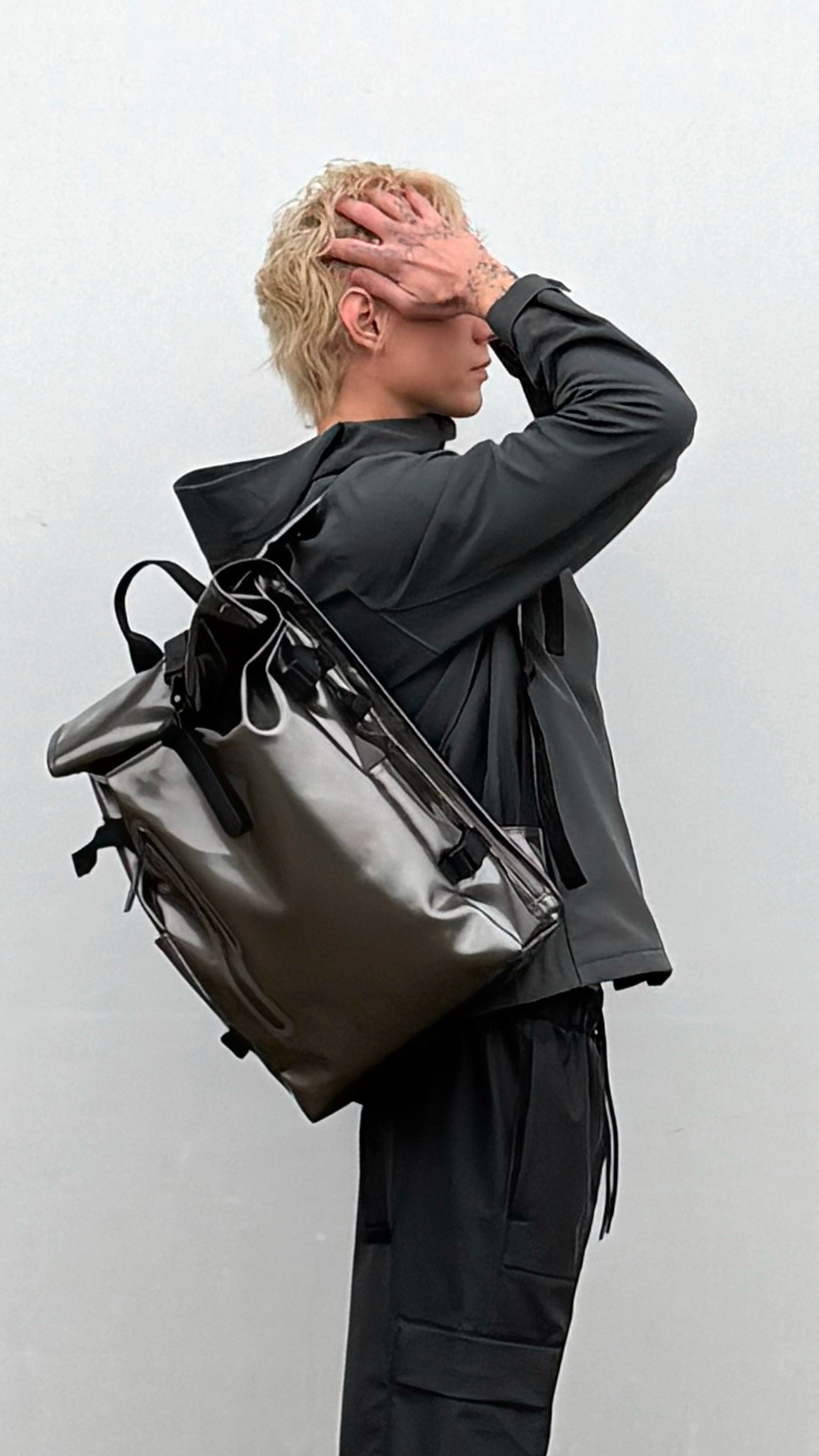 Rolltop Rucksack Large is gesneden uit Rains' kenmerkende waterdichte PU-stof, ontworpen voor draagkracht en duurzaamheid met een zacht gevoel.
