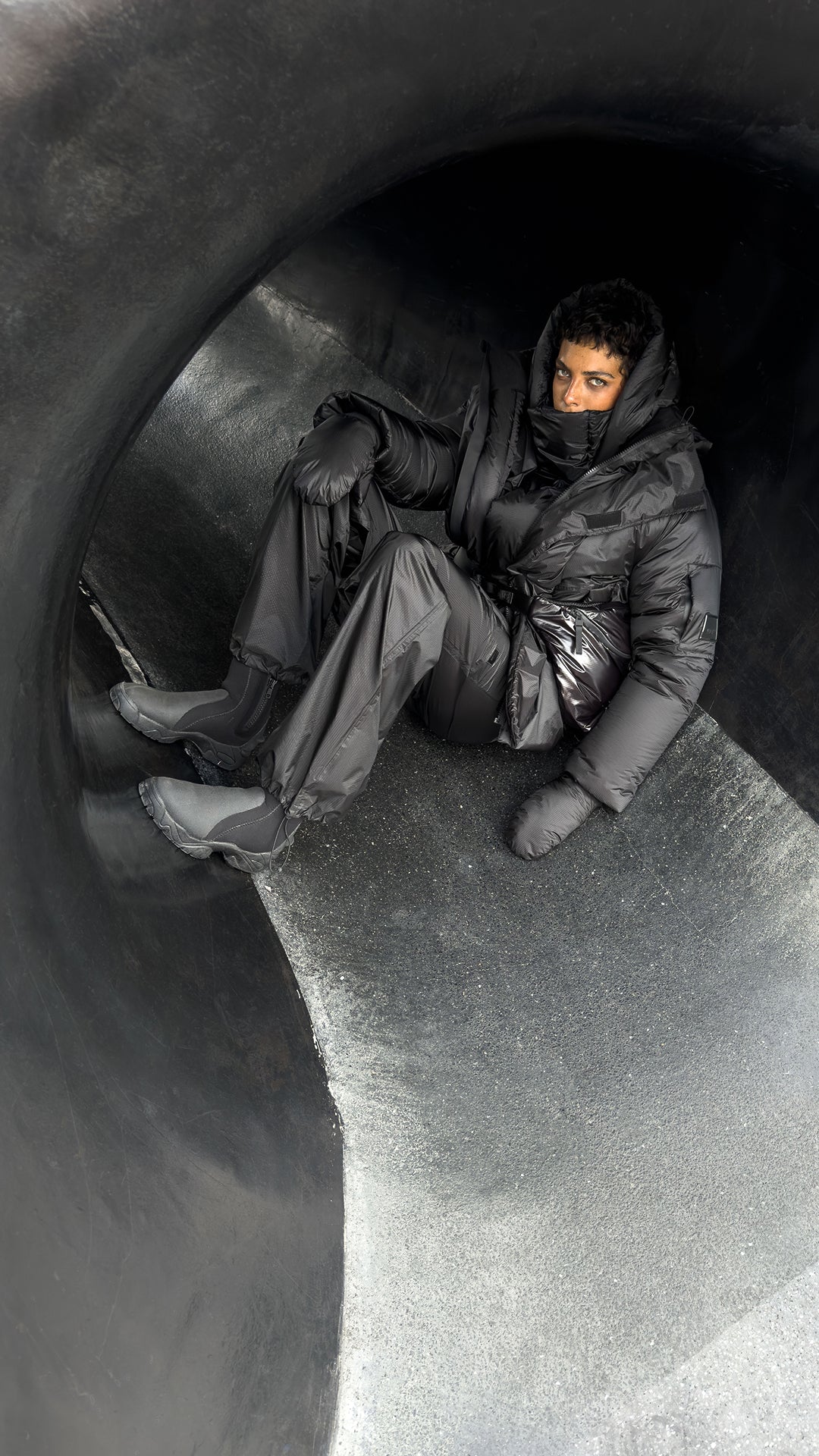 Het design is gemaakt met een losse toplaag van nylon ripstop. Het silhouet heeft een semi-transparante en zachte matte afwerking.