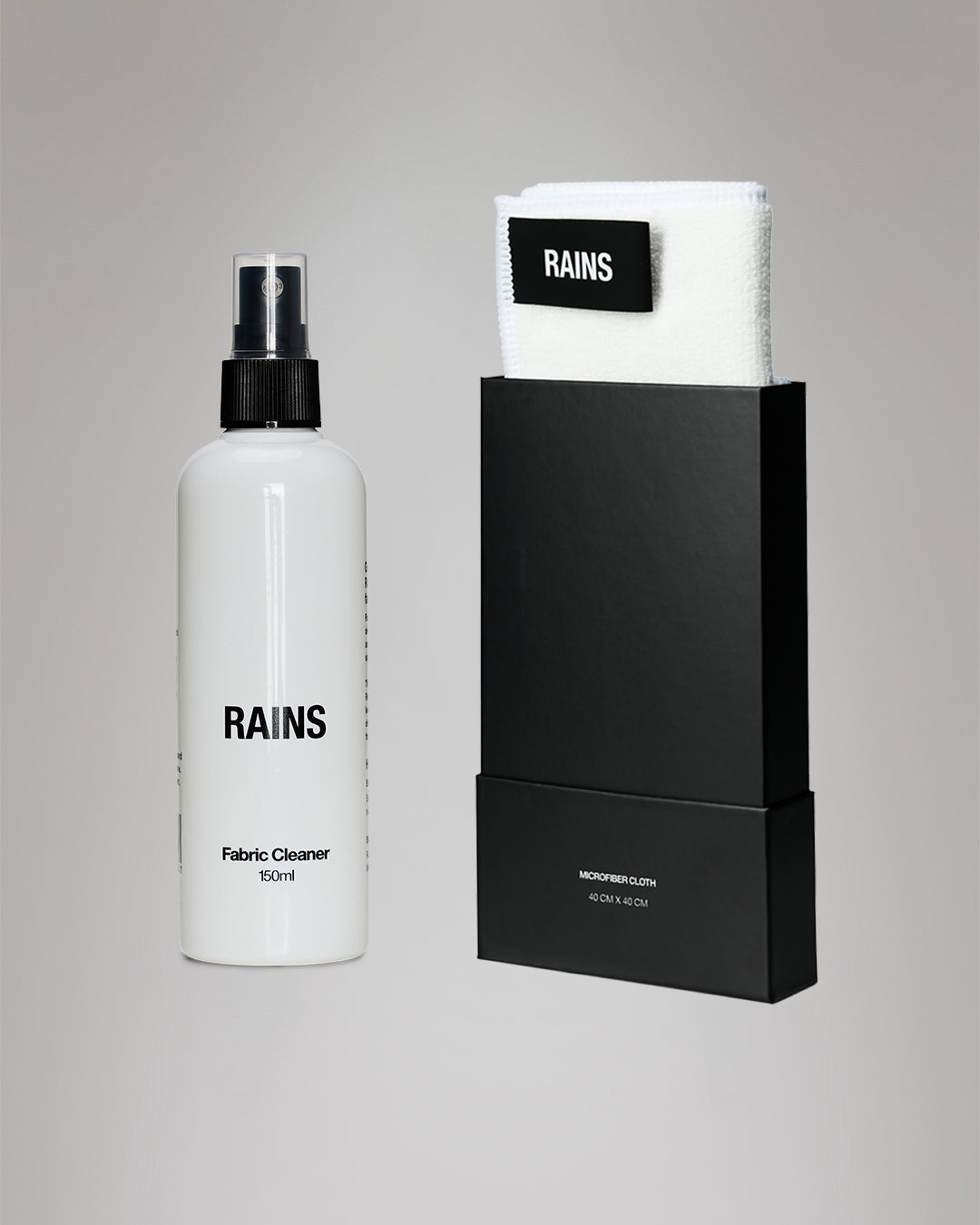 Bij zichtbare vlekken: gebruik Rains Fabric Cleaner. Spray direct op de vlek en veeg schoon met de Rains Microfiber Cloth.