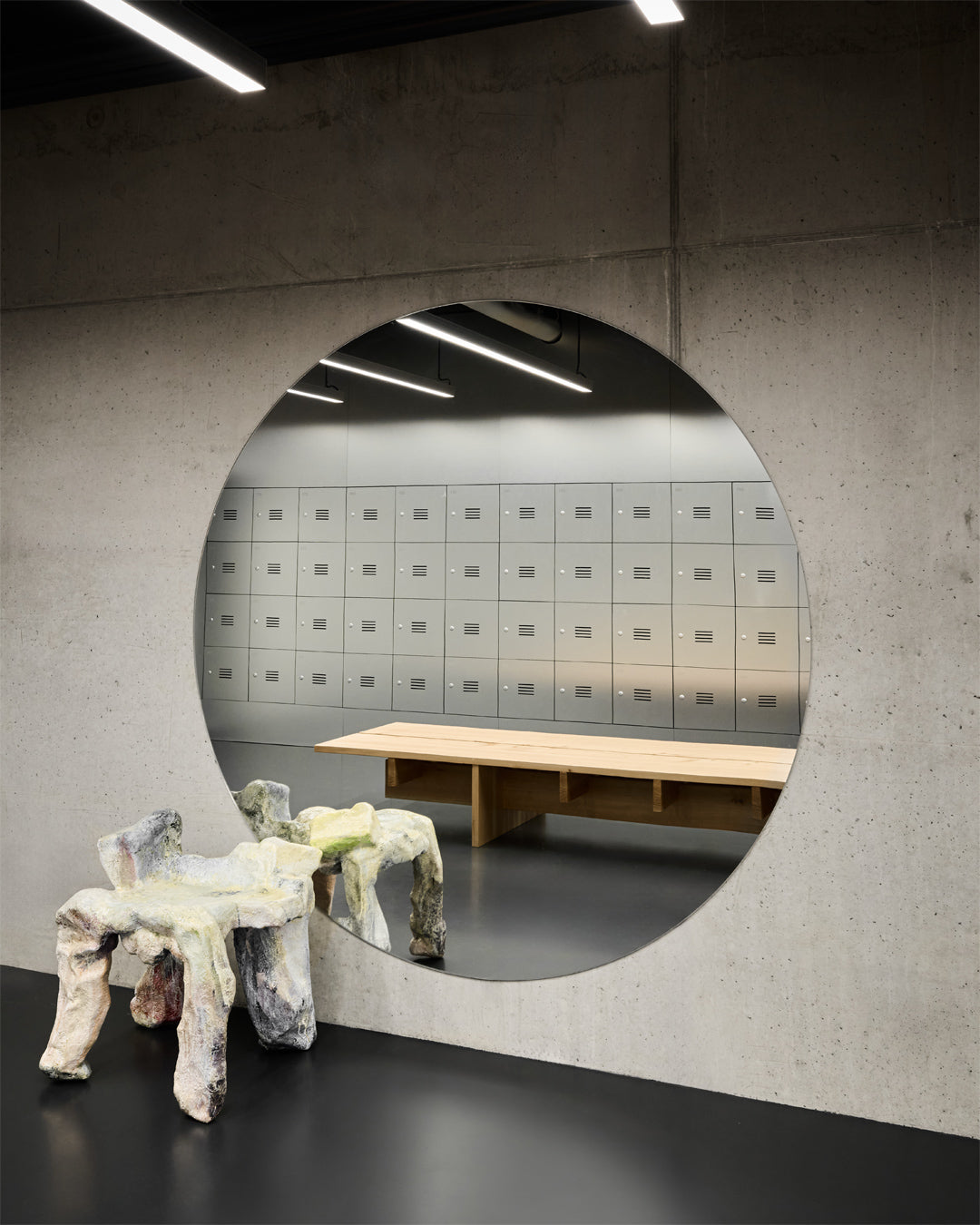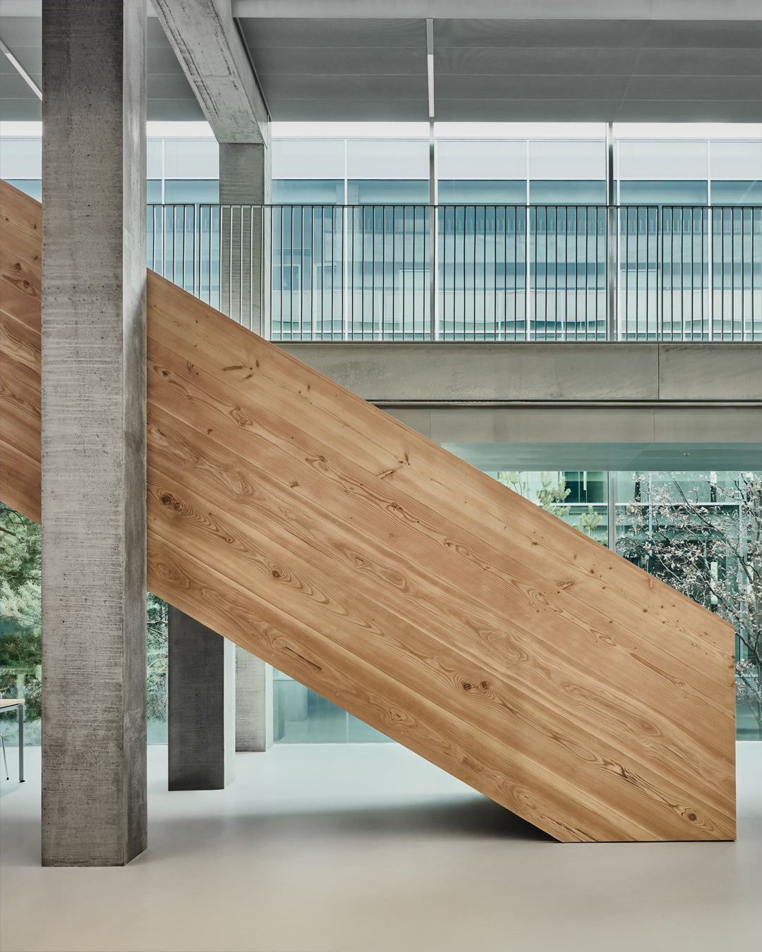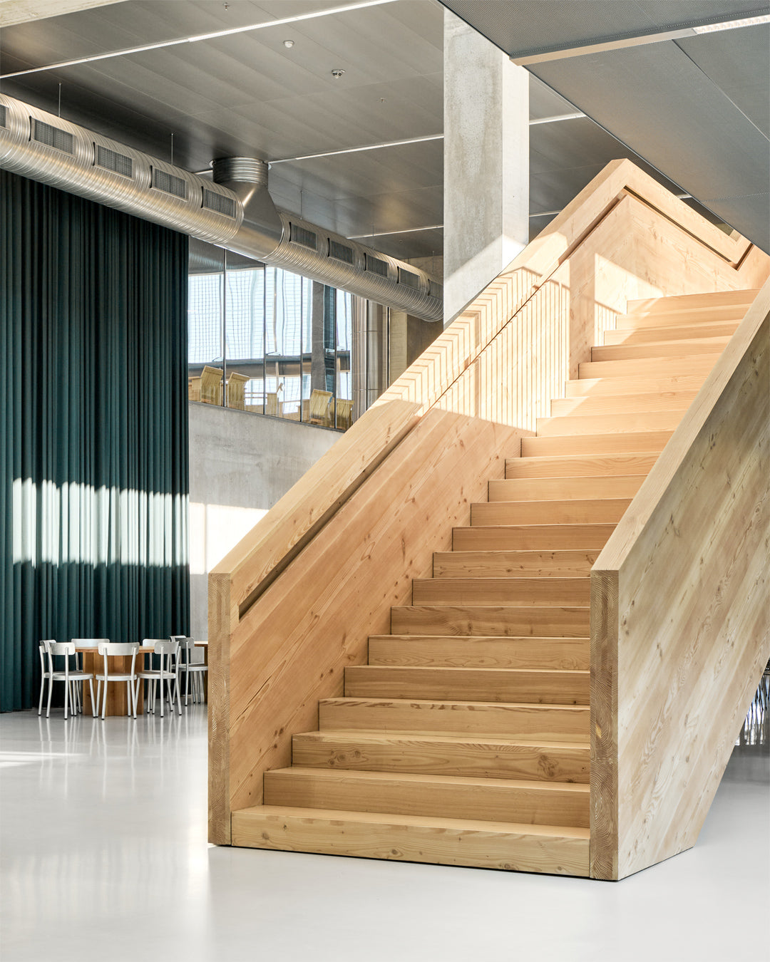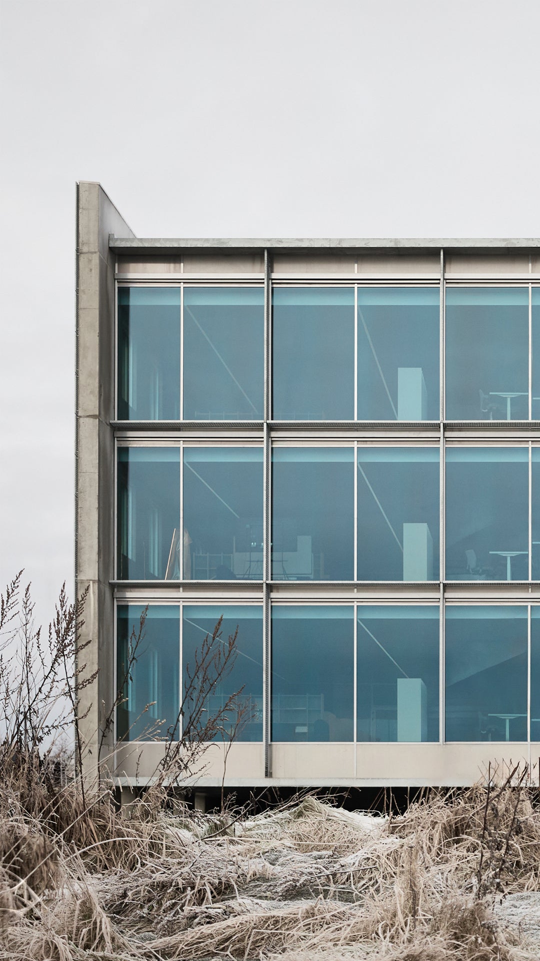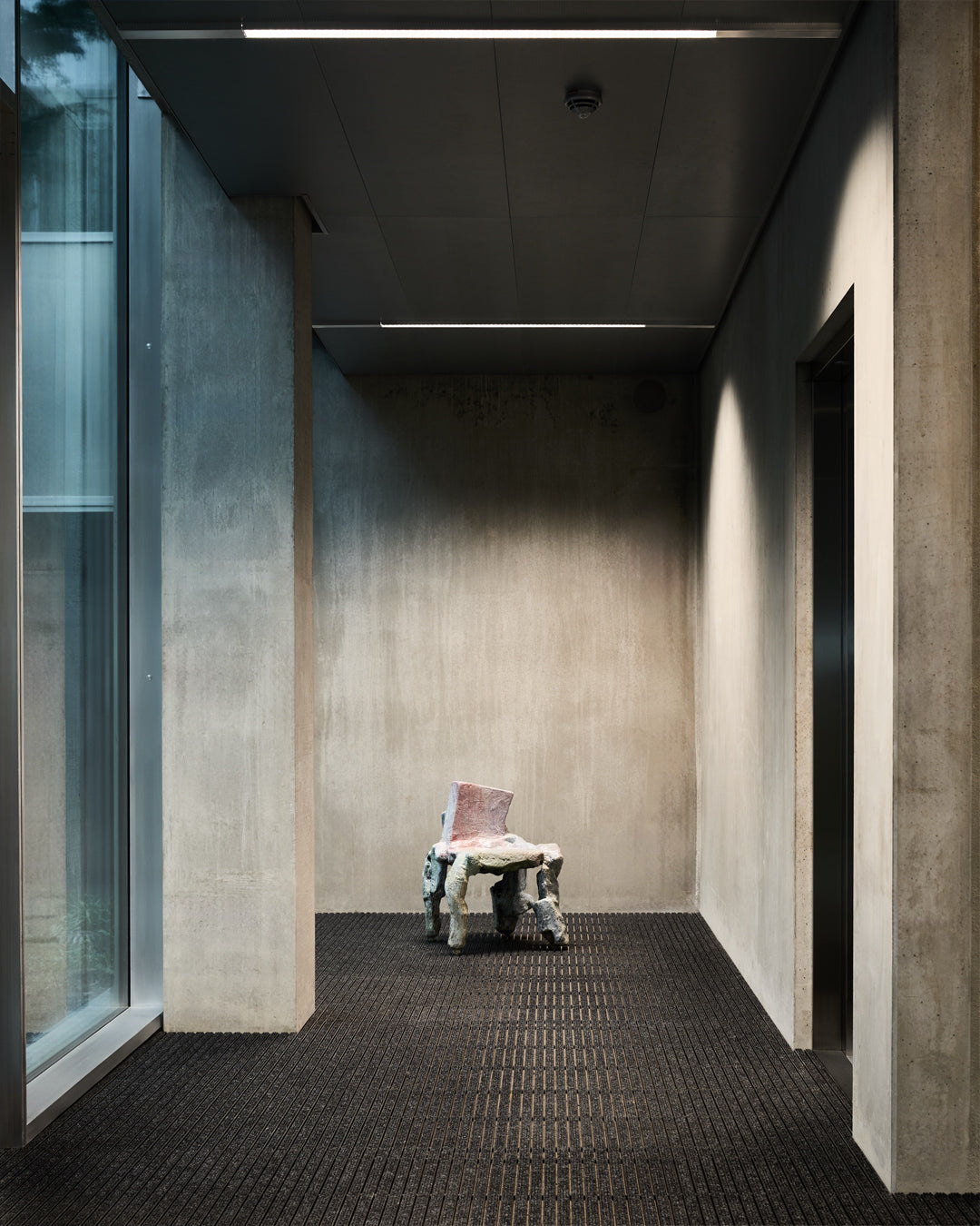 Behind the minimalism, there’s warmth in the details. The building is coated in a serene grey pantone. A simple backdrop for the brighter soft furnishings and budding art collection within. Hanging impressively over the HQ's entrance is one example of this collection: a glass chandelier by local artist Alexander Kirkeby. Elsewhere, custom rugs have been placed on every floor, each representing abstract weather patterns. A nod to purpose.