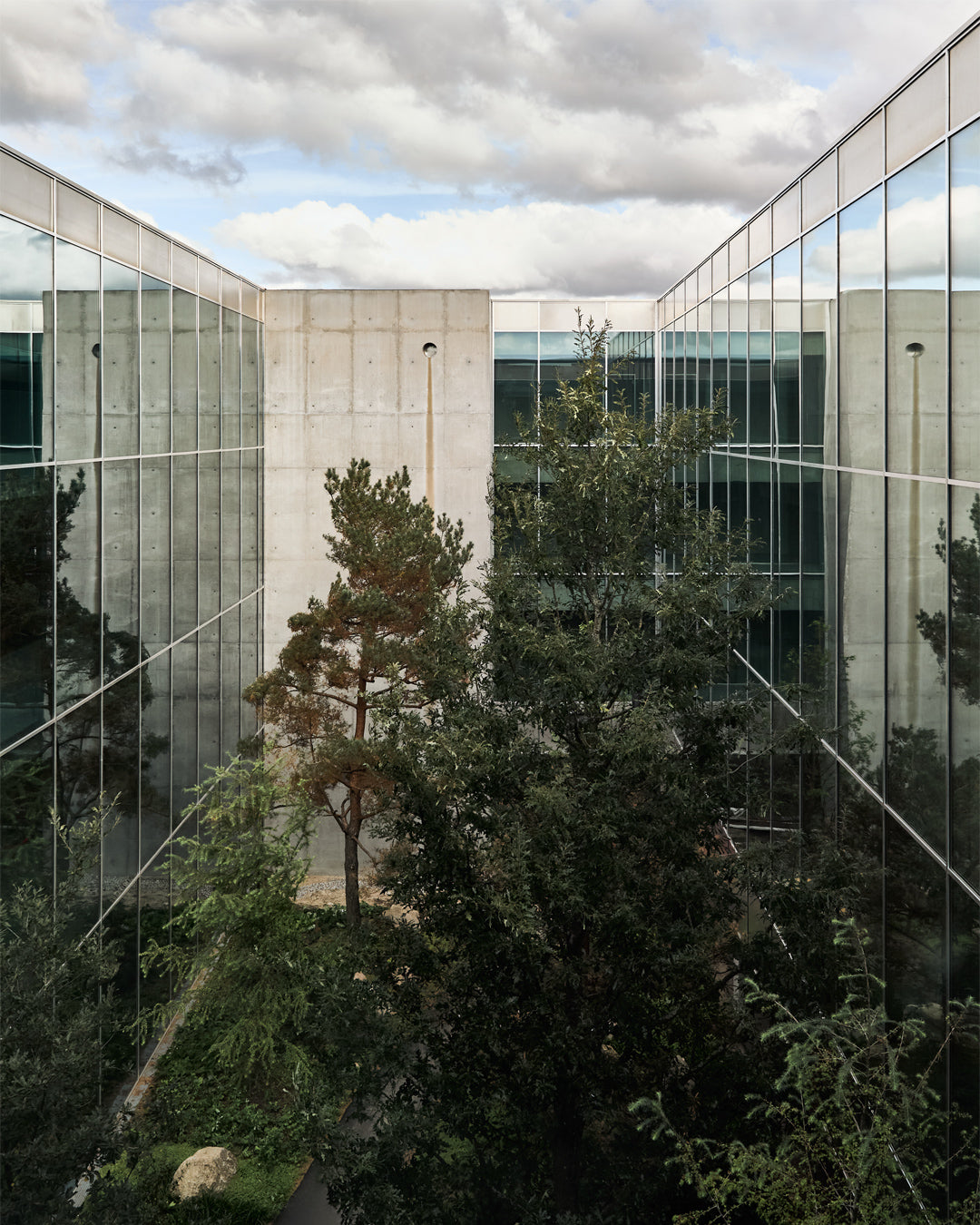 Rain feeds this headquarters. Specially placed vents direct rainwater from the building into the landscape. Where pathways have been built so that, over time, streams form and nourish the surroundings. Another vent placed high on the concrete wall overlooking the atrium waters a living wall. A vertical garden still to flower. The headquarters will evolve. Visitors returning in 2030 will see a very different space. Wilder. The real balance of Rains. The urban outdoors—industrial and organic.